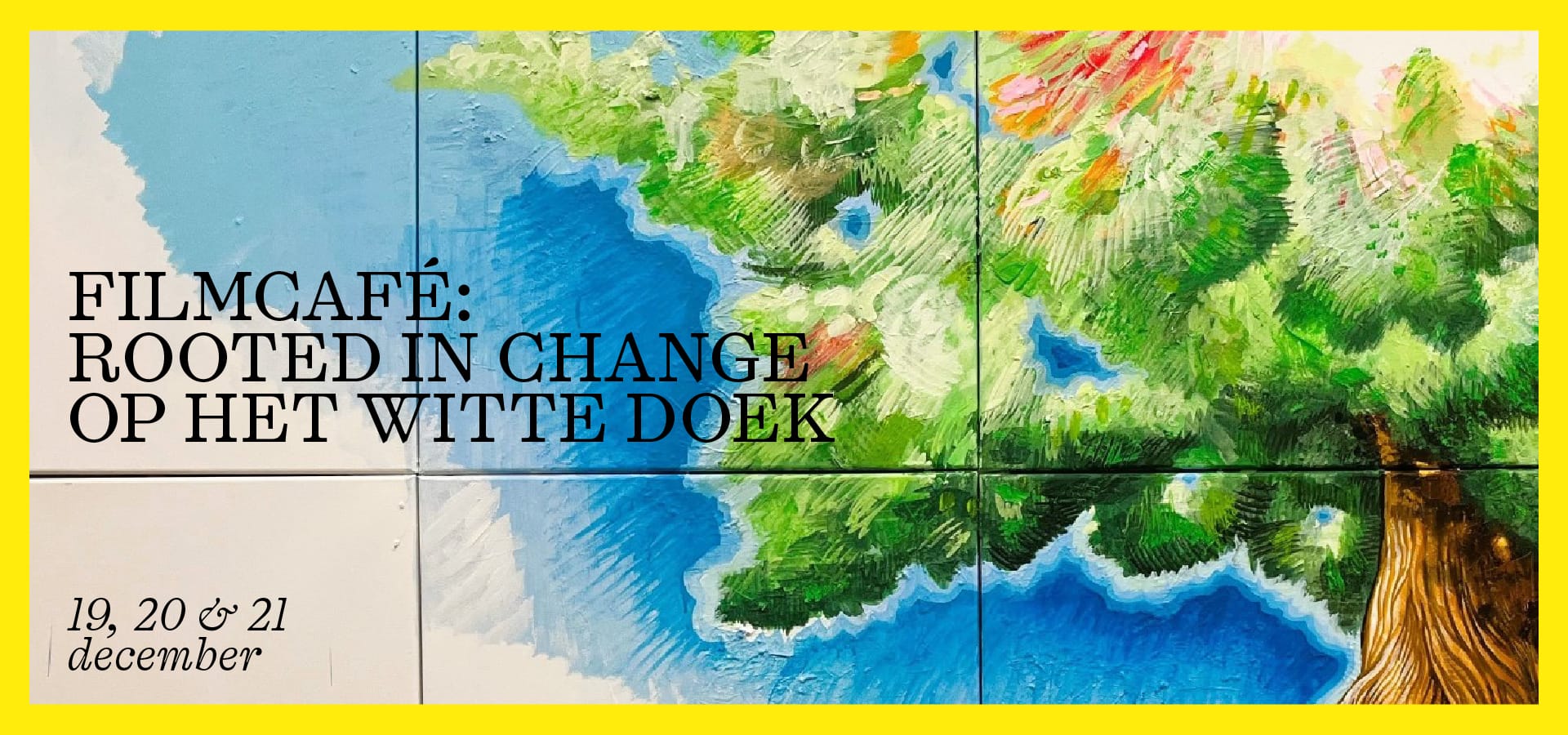 We openen het weekend op vrijdag 19 december in het Royal Theater. De foyer verandert die avond in het Filmcafé Rooted in Change. Wouter Greven, programmeur bij Lumière Cinema, gaat in gesprek met de drie kunstenaars. Je hoort hoe film hun werk beïnvloedt, waarom deze titels zo bijzonder zijn en welke films bijna gekozen werden.